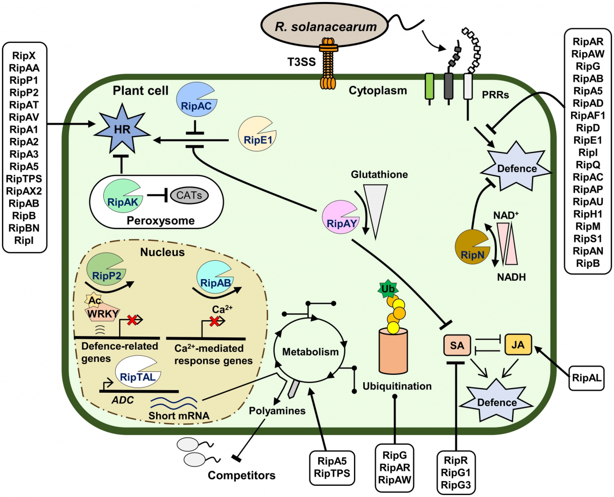 和其他致病菌一样,青枯菌的效应子共同作用于其在植物中的适应度,包括破坏植物的基础免疫反应,例如RipAY被真核生物的硫氧还蛋白选择性激活来降解植物中的谷胱甘肽,从而降低寄主植物的免疫;操纵寄主植物代谢过程以有利于细菌的生存,加强感染,一个最好的例子就是RipTAL,通过诱导植物合成多胺基因的表达,从而逃避原有的植物监管机制,而且还可能通过这种行为抑制其竞争病原菌的繁殖以抢占生态位。除此之外,通过使单个或多个基因缺失,发现很多T3E基因对青枯菌的毒力表达起着重要作用,但是其分子机制还未解析。